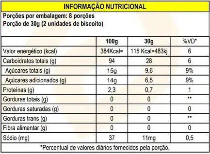 | Porções por embalagem: 8 porções Porção: 30g (2 unidades de biscoito)  | |||