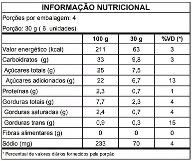 | Porções por embalagem: 4 Porção: 30g (6 unidades)  | |||